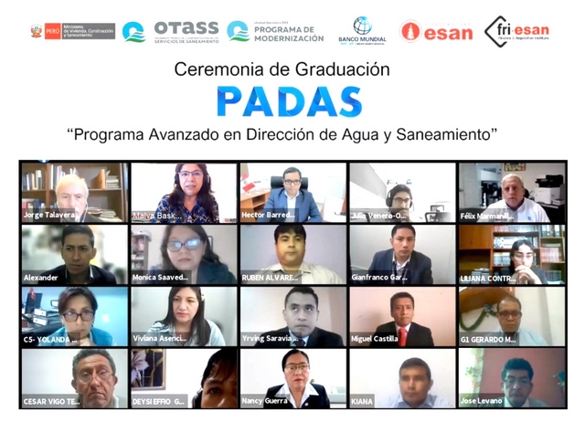 El Programa Avanzado en Dirección de Agua y Saneamiento (PADAS), el primero de este tipo que se dictó en la Universidad ESAN, en la modalidad mixta. virtual y presencial, como parte de un contrato suscrito entre el OTASS y la prestigiosa casa de estudios, estuvo dirigido al personal de las diferentes áreas de las 48 EPS, a fin de capacitarlos con este programa de alto nivel para potenciar sus conocimientos y capacidades en la gestión, administración y operación de estas empresas.