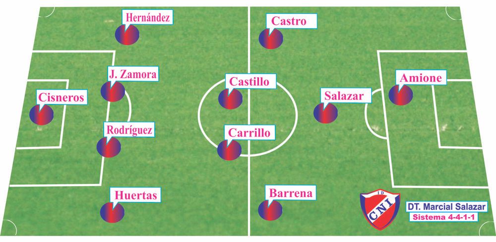 En la portería, Jesús Cisneros, el de siempre. La defensa es prácticamente la misma de los últimos cinco partidos: Luis Hernández, José Zamora, Kike Rodríguez y Miguel Huertas. En la volante sí hay modificaciones, van al banco Portilla y Campos; juegan Hugo Castillo y Wilmer Carrillo como ‘perros de presa’; por izquierda, con la venia de ser un delantero más, irá el colombiano Leonardo Castro; por derecha el capitán Carlos Barrena. Un poco más adelantado, en el medio libre y suelto para generar jugadas estará Ryan Salazar. Adelante y luchándola todas por arriba y por abajo, estará el argentino Federico Amione.