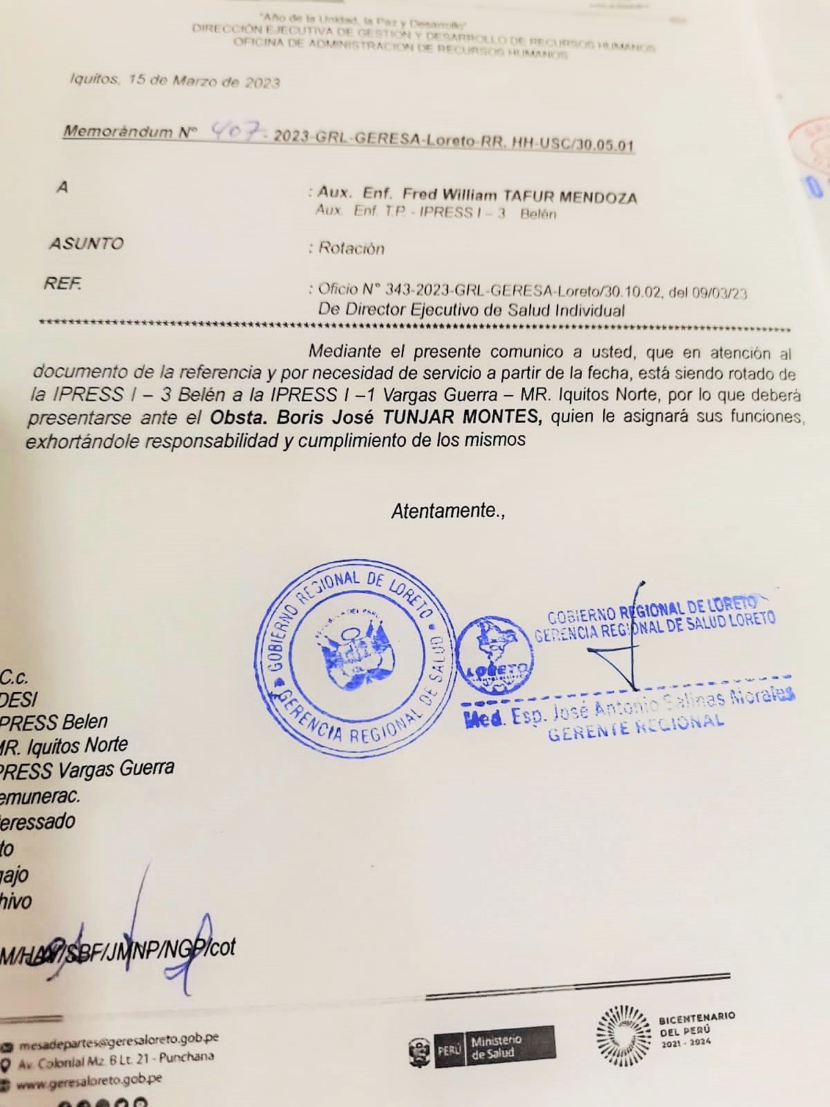 Hace poco hubo protesta en la gerencia regional de salud porque muchos no están de acuerdo con la designación del administrador John Marichin Huansi, de quien la Contraloría dijo que no cumplía con el perfil para que se desempeñe en el gobierno regional de Loreto. Hoy lo han enviado a Geresa.