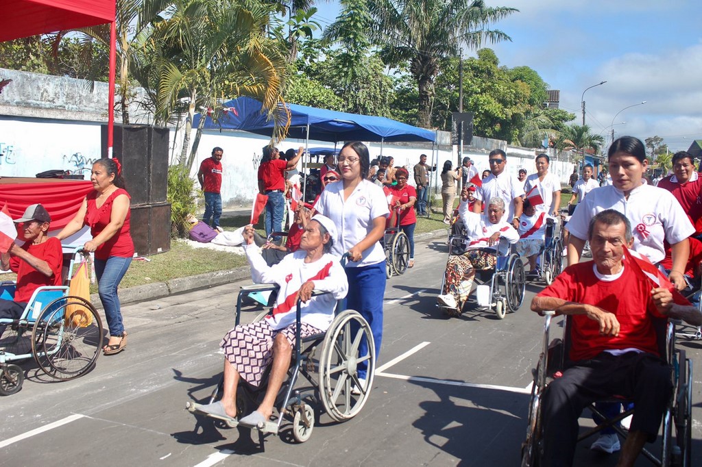 Luego se procedió al izamiento del Pabellón Nacional a cargo de la gerente general de la SBI y del adulto mayor Rubén Rojas, seguidamente se entonó el Himno Nacional del Perú, prosiguiendo con las palabras alusivas a la fecha de la albergada Juana Angélica Ruíz viuda de Pereira, culminando el programa con el desfile del agrupamiento de beneficiarios del CEAPAM “San Francisco de Asís” y de las delegaciones del Centro Integral de Atención al Adulto Mayor (CIAM) de las municipalidades de Belén, Punchana, San Juan Bautista y Maynas, al igual que de los adultos mayores del Hospital Apoyo Iquitos, cerrando el desfile el personal administrativo, asistencial y de servicio del CEAPAM con el acompañamiento de la banda de músicos de la I.E.P.S.M. N° 60188 Libertador Simón Bolívar.