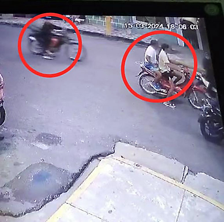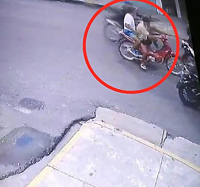 De acuerdo a las imágenes captadas en vídeo vigilancia, se observa que dos de los cuatro sujetos asaltantes, pistola en mano se baja de una de las motos para tratar de despojar el dinero de su víctima, pero no logra su objetivo, ya que corre el empresario al otro lado de la acera instantes que hace su aparición un auto particular color rojo en su interior agentes PNP del DIVIAC Iquitos, quienes tras lograr impedir se concretice el asalto y robo, proceden a realizar la persecución de los mismos por las calles de la ciudad.