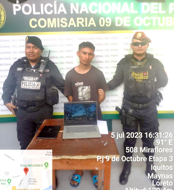Los testigos señalaron que el hombre vestía un polo de color negro y pantalón short color verde petróleo con sandalias color negro con celeste de aproximadamente 22 años, y que el presunto autor se estaría desplazando por referida carretera a pie, por lo que personal policial al tomar conocimiento, procedió a realizar un patrullaje exhaustivo, logrando intervenir a la altura de la carretera Santo Tomás con pasaje Victoria a la persona de Brandon Esli Del Águila Curitima (22) natural de Caballococha, a quien le encontraron en su poder una laptop, marca Lenovo, color Plata, con serie Nº MTM80X2003LM y una Tablet Color negro marca Lenovo TBX505L, serie Nº 806647051585074.