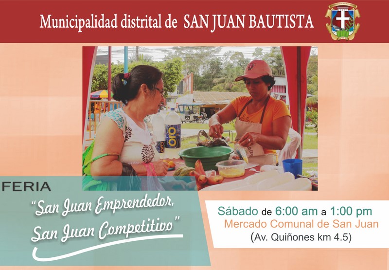 Todos los sábados los vecinos sanjuaninos y vecinos de otros distritos aprovechan en hacer sus comprar semanales en la «Feria San Juan Emprendedor, San Juan Competitivo», ya que esta importante Feria Sanjuanina ofrece siempre las mejores ofertas en productos regionales, pescados y frutas; y ahora, esta importante feria tan representativa de la actual gestión está atendiendo en el mercado comunal de San Juan, para brindar mayor comodidad a las mujeres vendedoras y al público asistente.