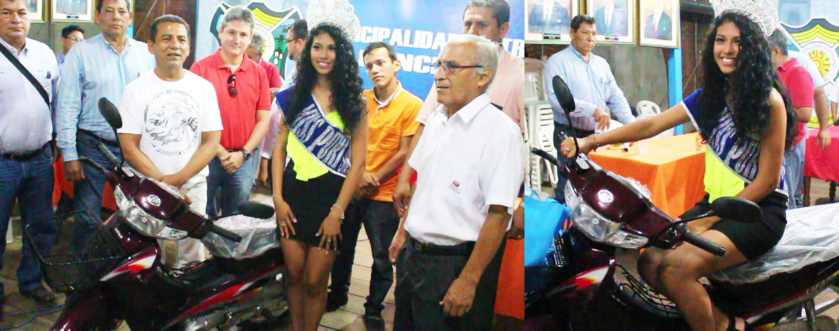 Ayer, después de una sesión de concejo, en presencia del administrador de la empresa SOCOPUR y los regidores de la comuna, el burgomaestre punchanino, Euler Hernández Arévalo, hizo entrega de los premios al primer lugar del certamen de belleza “Miss Purísima 2015” que consistió en una moto 0 kilómetros, tratamientos de belleza, un teléfono celular de última generación y sorpresas, además aprovechó en darle unas palabras para integrarla al trabajo que se viene realizando para cambiar el rostro del distrito de Punchana.