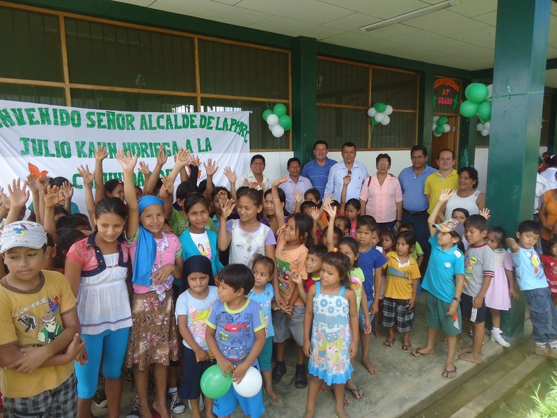 El alcalde estuvo acompañado del Ing. Ramiro Pinedo Carranza, gerente de la Subregión Caballo Cocha, Prof. Johnny Ramos Palacios, representante de la UGEL-Ramón Castilla, los regidores, Sra. Artemisa Sinarahua de Saavedra y Raúl Sánchez Flores y funcionarios de la Municipalidad de Ramón Castilla, quienes fueron recibidos por las autoridades de la localidad, padres y madres de familia, alumnos, docentes y moradores en general.