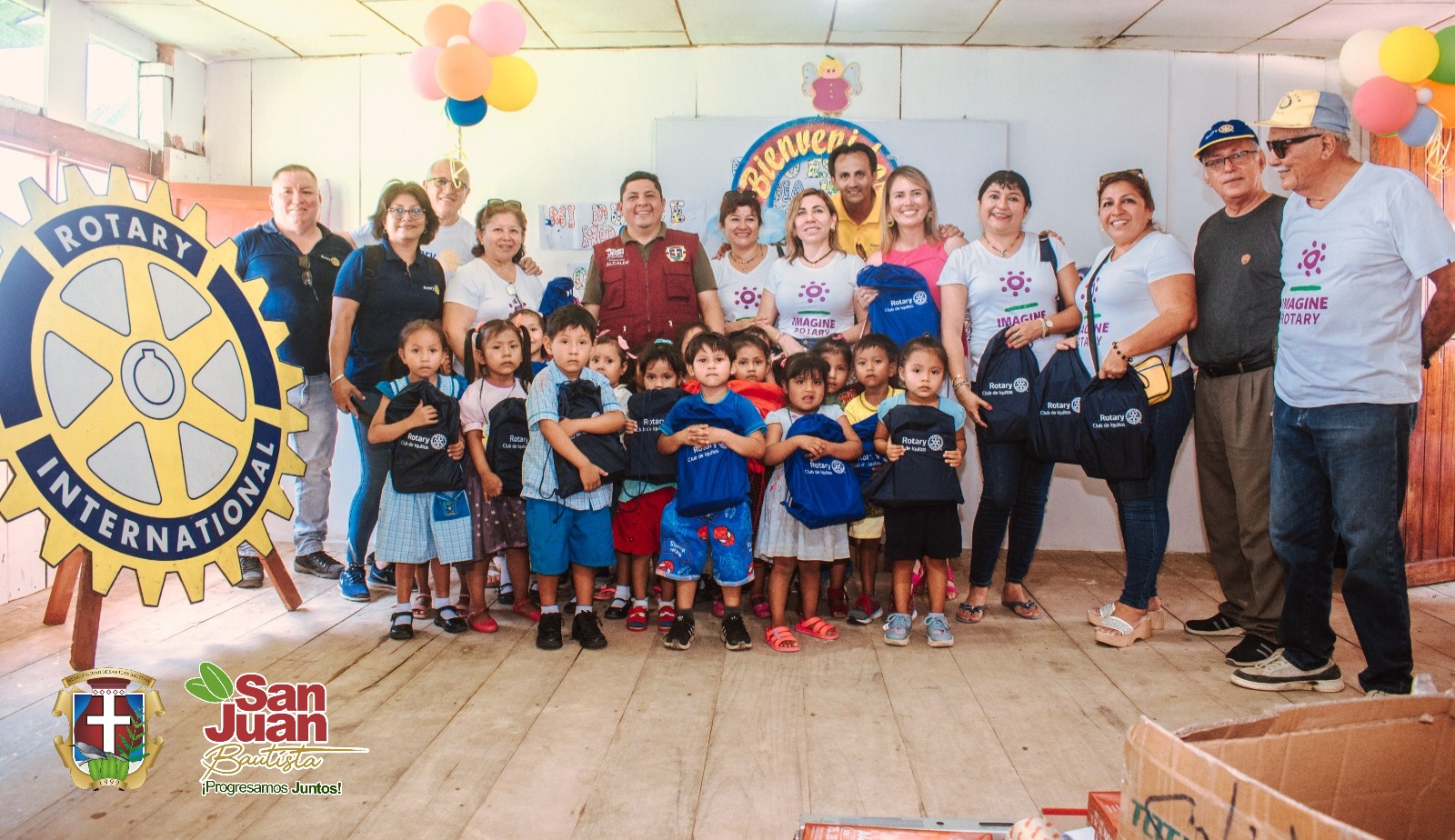Con la finalidad de reforzar lazos institucionales en favor de la comunidad, el alcalde de la Municipalidad Distrital de San Juan Bautista Dr. Joel Parimango Álvarez junto al Rotary Club Iquitos, entregaron 105 Kits escolares para los niños de la Institución Educativa Jardín N° 899 “Los Angelitos de Jesús”.