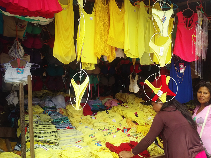 En una visita que se hizo ayer, se pudo observar la infaltable ropa interior de color amarilla pidiendo prosperidad para el 2016, aunque también vendían de otros colores como rojo para el amor y verde para la esperanza. Los costos varían de acuerdo al modelo, los bóxer cuestan 12 soles, mientras que los calzoncillos y calzones están entre 2 y 10 soles.