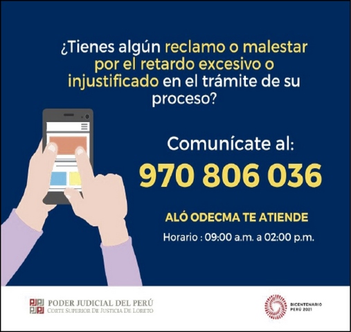 Con el objetivo de fortalecer el canal de comunicación con los usuarios judiciales, la Oficina Desconcentrada de Control de la Magistratura – ODECMA Loreto continúa brindando atención por su servicio telefónico y de WhatsApp “ALÓ ODECMA”.