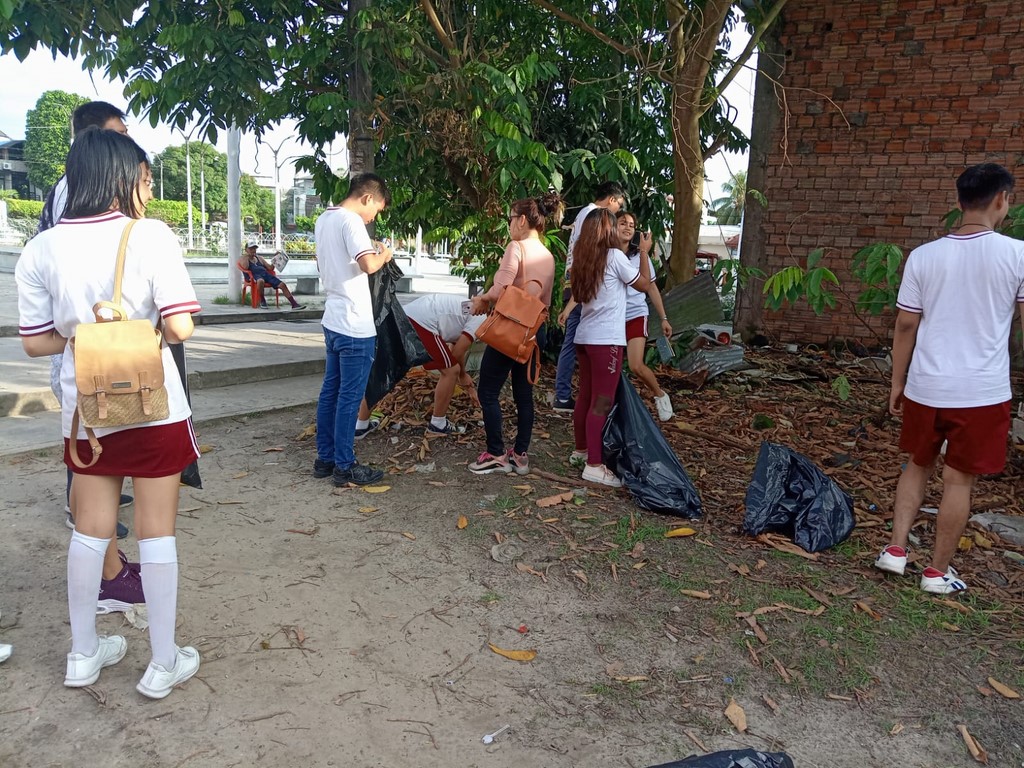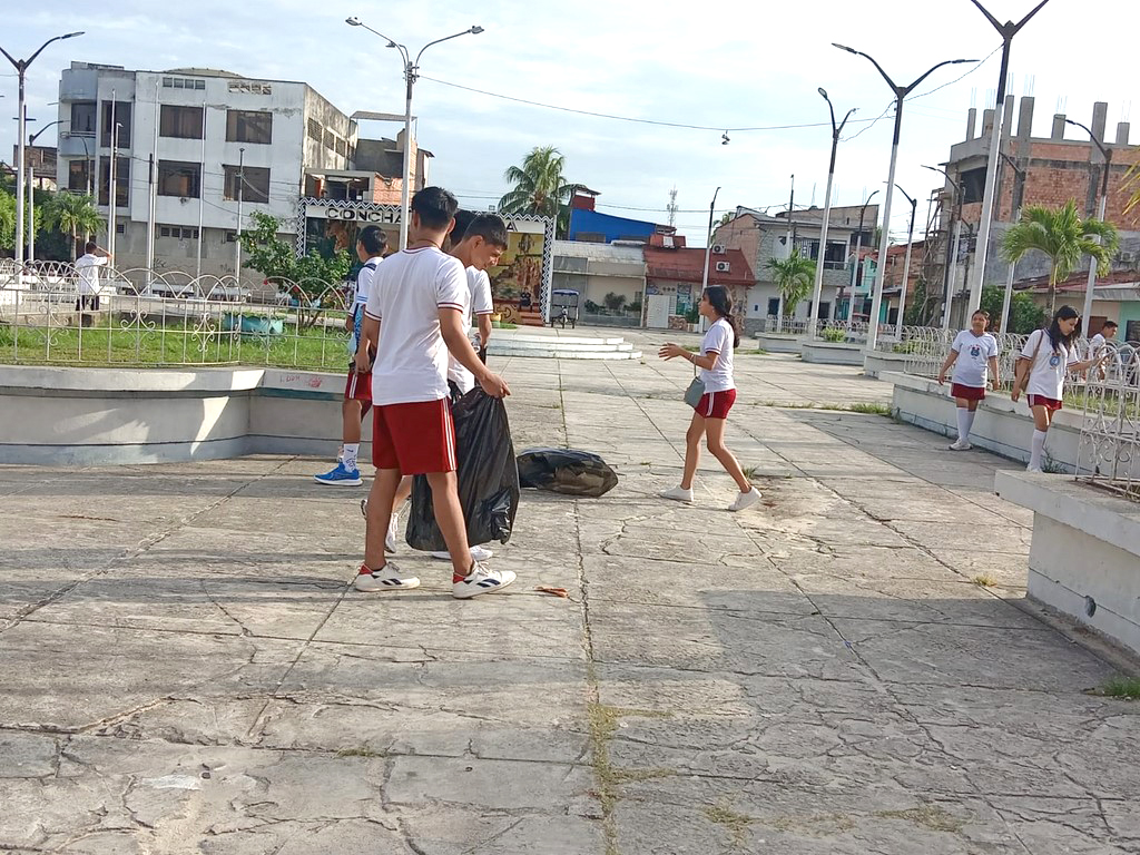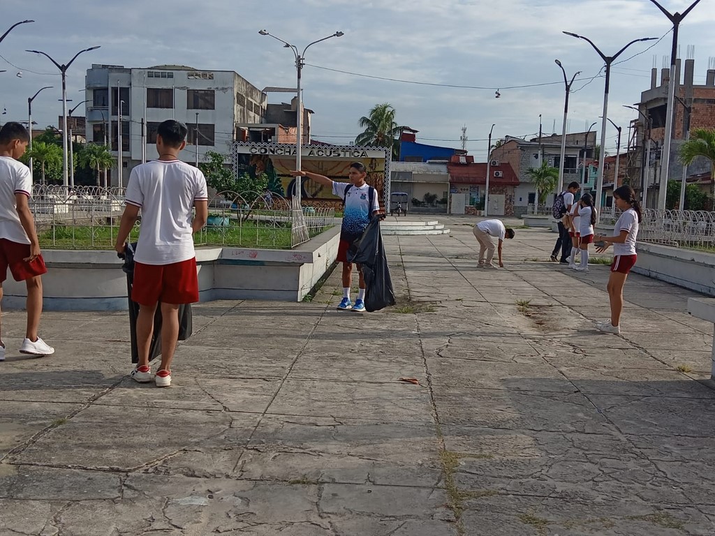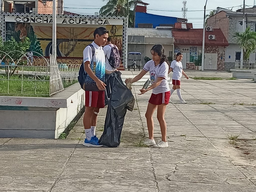 De esa manera llegaron hasta la plaza Estela Maris del distrito de Punchana, donde otro grupo de escolares tardó varios minutos para recoger toda la basura que estaba alrededor del espacio público. Llegando a encontrar botellas de plástico, botellas de vidrio, bolsas de plástico, envoltorios de galletas y dulces, además de papel.