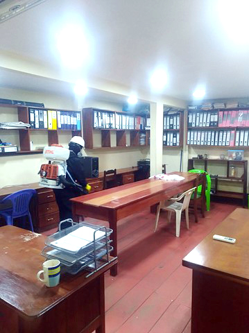 La fumigación se realizará durante esta semana e incluirá los ambientes de Almacén y Archivos de la DREL así como la I.E N° 61004 “Juan Pablo II donde se viene realizando el proceso de contratos 2021.