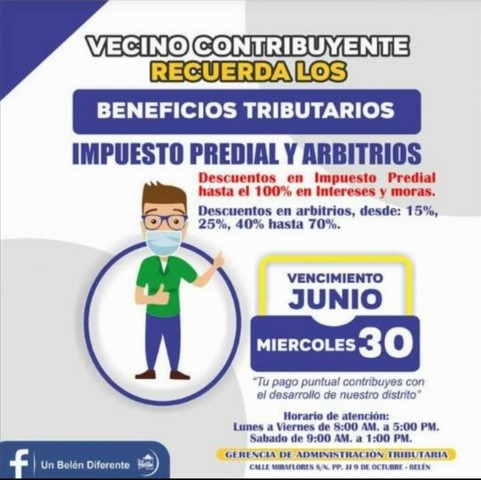 La fecha de vencimiento de la presente campaña tributaria es hasta el 30 de junio, no dejes de pasar esta oportunidad vecino belenino, te esperamos en la Gerencia de Administración Tributaria ubicada en la calle Miraflores S/N.