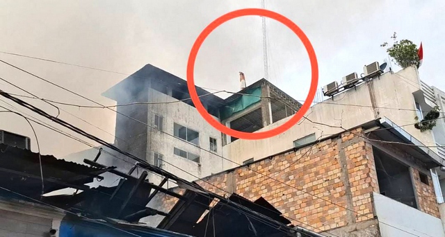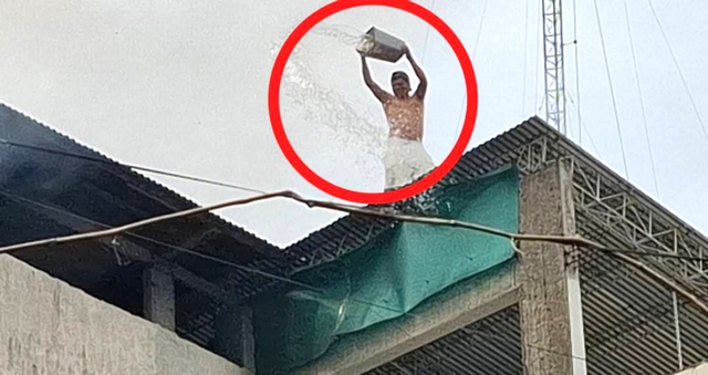 Un hombre, desde el tercer piso de una vivienda contigua, arriesgó su vida intentando ayudar a apagar las llamas. Sin medir el peligro, utilizó un pequeño balde con agua para evitar que el fuego alcanzara la pared cercana y se extendiera aún más.