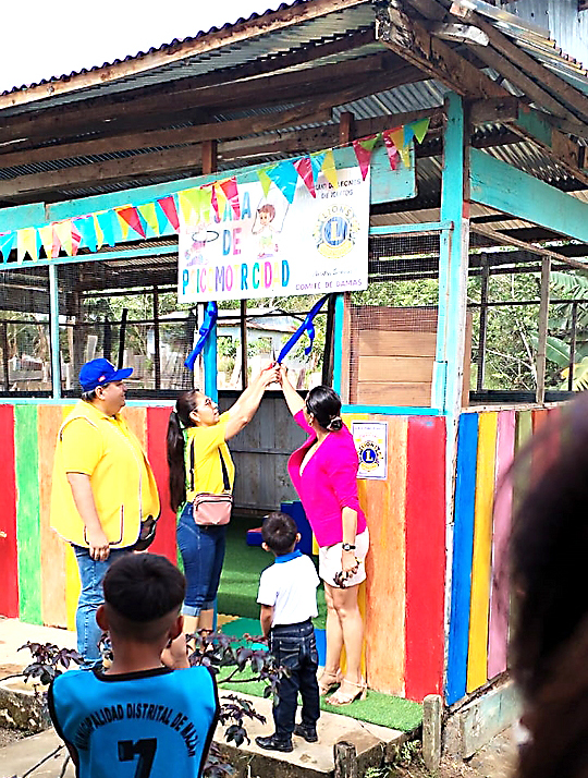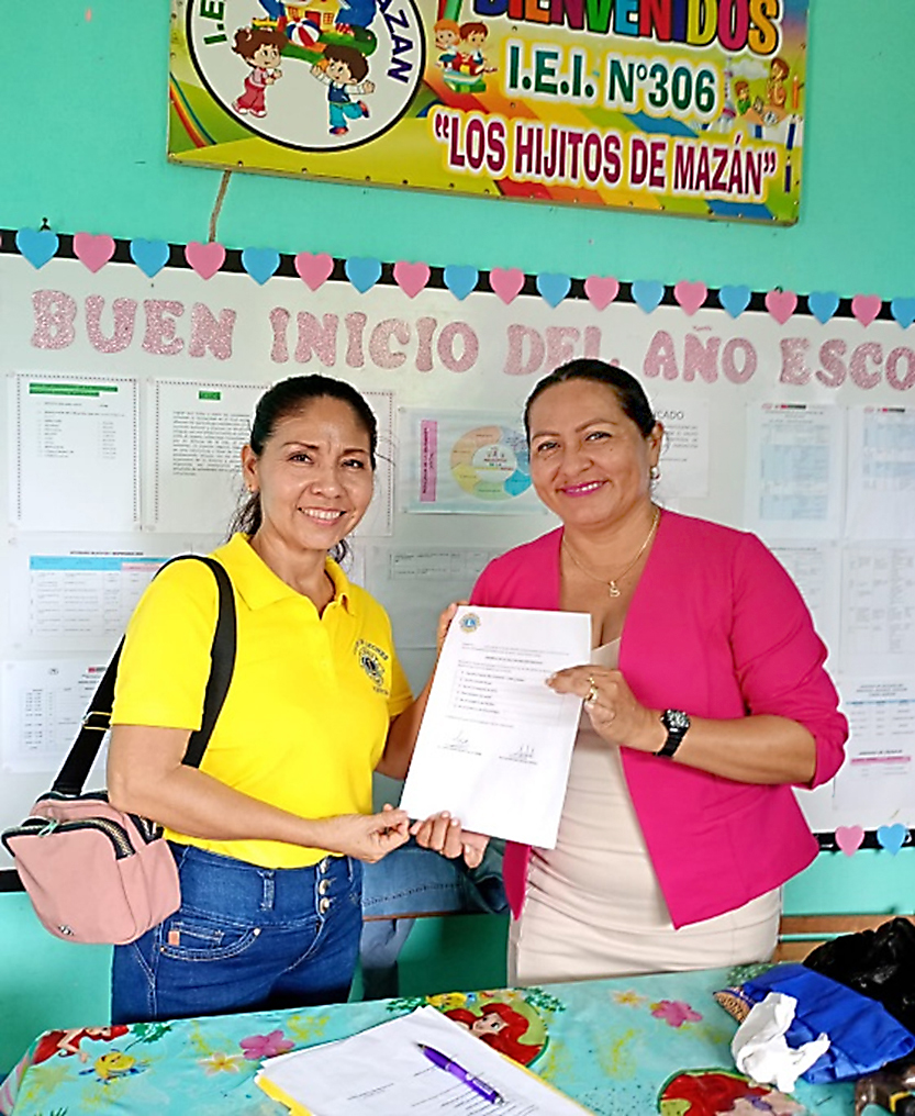 Ya en Mazan, fueron recibidos por una Delegación de Padres de Familia junto a su Directora y fueron trasladados en motokar hasta el Centro Educativo Inicial donde los profesores y padres de familia les presentaron números artísticos por los niños siendo el agrado de los visitantes, el Presidente del Club de Leones de Iquitos Compañero León Max Themme en representación de los Leones hizo uso de la palabra agradeciendo por la acogida recibida, posteriormente la Presidente del Comité de Damas, Luza Noemí Rojas de la Torre hizo la donación a la Directora del Colegio, consistente en: Pintado de la sala psicomotriz del colegio, letrero del aula, piso con césped artificial y Baner. Así mismo se donó tapetes de colores, una piscina para niños con 1,000 pelotitas, un Saltarín, una casita con balón y cesta y una mecedora tipo caballito. A su turno la Directora de la Institución Educativa Lic. en Educación, Sisi Beatriz Araujo Tuesta, a nombre de sus profesores y estudiantes, agradeció la donación resaltando la importancia que tendrá la donación para los niños en su desarrollo psicomotriz. Es así que el Club de Leones de Iquitos, fiel a su lema “Nosotros Servimos” cumplieron una actividad más de servicio, en bien de la niñez y la Comunidad Loretana.
