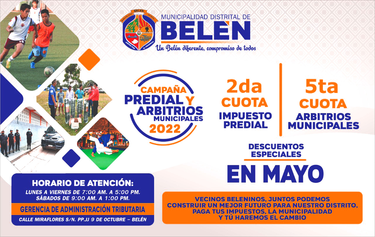 Vecinos beleninos, con tus pagos puntuales podremos brindarte un mejor servicio y hacer de Belén un distrito más ordenado, limpio, saludable y con mayor seguridad. Acércate a pagar tus tributos e impuesto predial en la Gerencia de Administración Tributaria de la MDB, en calle Miraflores S/N P.J 9 de Octubre en el horario de 07:00 a.m. a 05:00 p.m. y los sábados de 09:00 a.m. a 01:00 p.m.