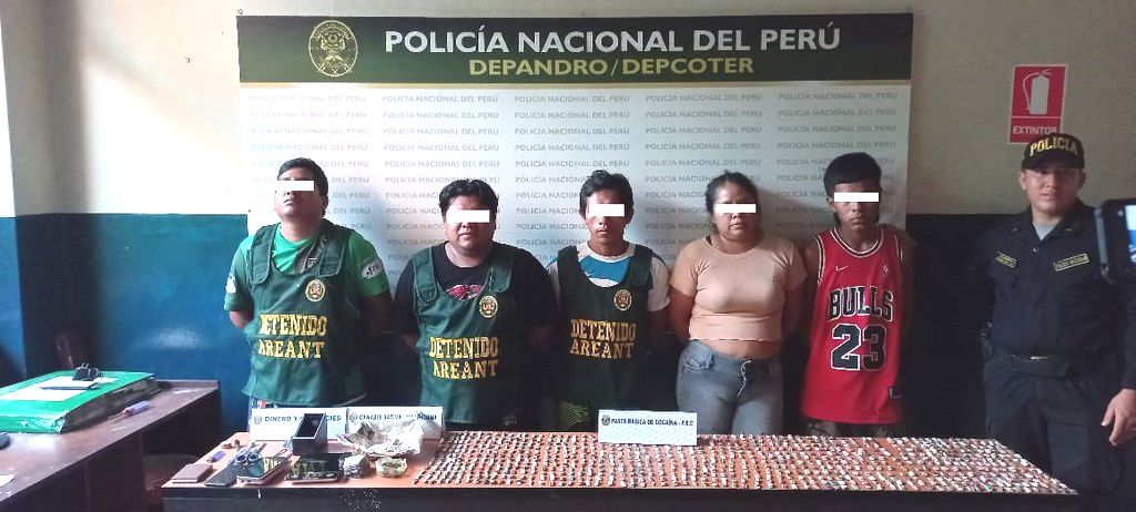 De inmediato, los agentes antidroga se constituyeron hasta el lugar y tras una discreta vigilancia lograron intervenir el inmueble ubicado en la carretera Iquitos-Nauta km 5.5 pueblo joven Quistococha – Mz “J” – lote 16 en el distrito de San Juan Bautista; en cuyo interior encontraron a Mayra Cling Moreyra (32), Jerison Jaime Inuma Huayunga (27), Juan Miguel Sangama Gómez (32), Darnel Augusto Pinedo Silva (26) y un menor de 17 años de edad. Los efectivos policiales procedieron al registro domiciliario, encima de una mesa de madera, lograron encontrar la cantidad de 2 mil envoltorios de “ketes”, los cuales contenían pasta básica de cocaína (PBC).