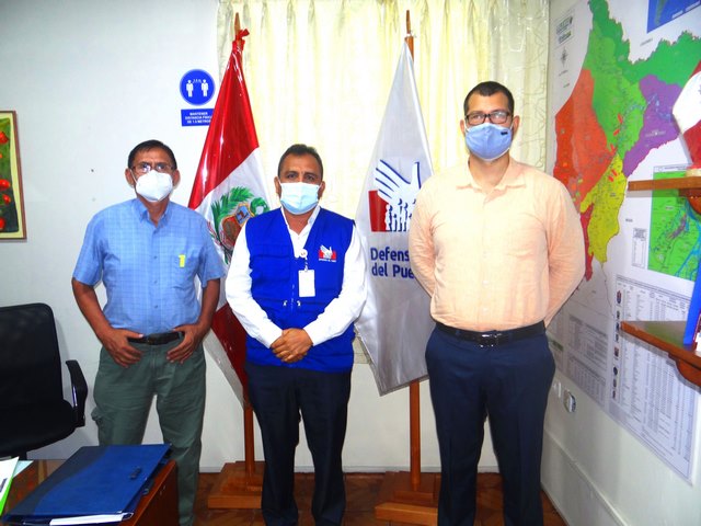 El presidente de la Cámara de Comercio, Industria y Turismo de Loreto, Sr. Ricardo Boria Jesson, junto al asesor legal de la CCITL; Abg. Martin Casuso y en compañía de un empresario afectado por las invasiones de terrenos; r. Noé Cheglio Antonio, sostuvieron importante reunión con el Defensor del Pueblo, Abg. Abel Chirino Becerra en su despacho.