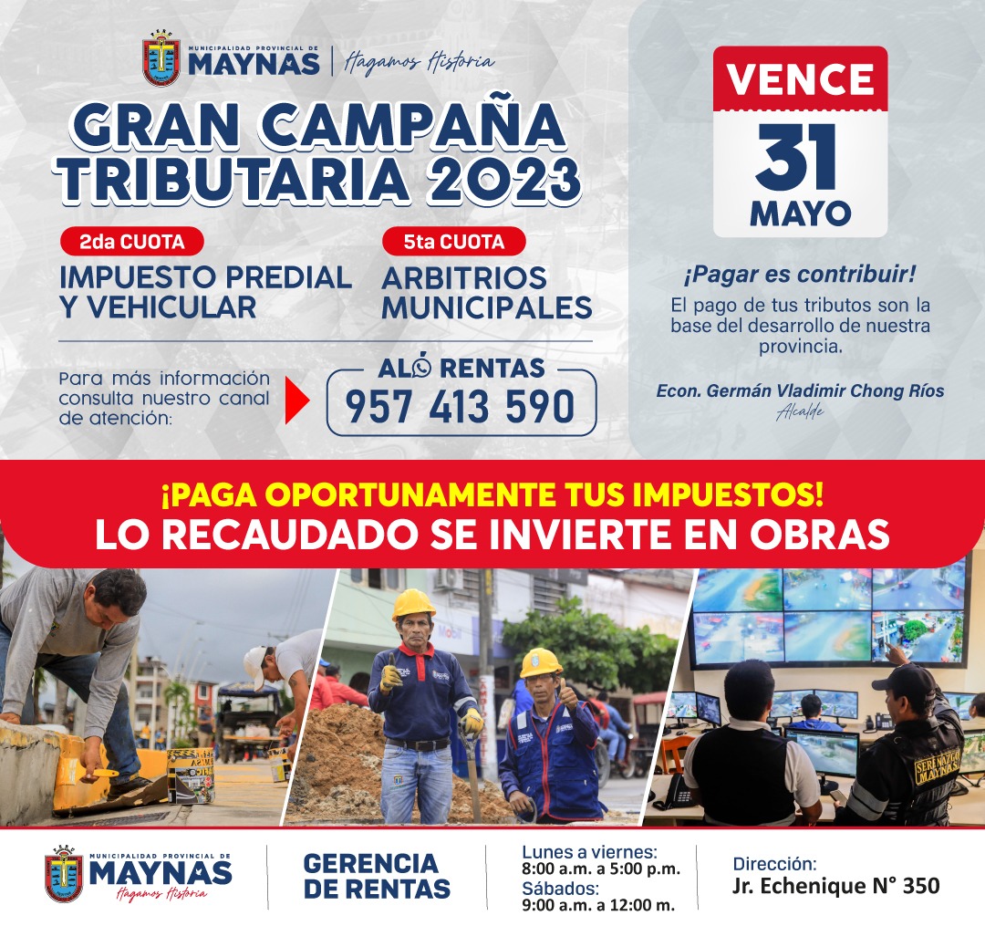 La Municipalidad Provincial de Maynas a través de la Gerencia de Rentas, pone en conocimiento de los vecinos y vecinas y que la Gran Campaña Tributaria 2023 vence este 31 de mayo.