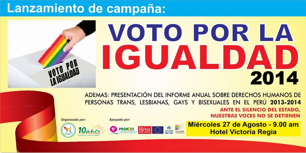 Este evento servirá de marco para presentar una novedosa campaña denominada «Voto por la Igualdad» iniciativa apoyada por Unión Europea, Fundación Triángulo, Hivos, Victory Institute y PROMSEX que tiene como objetivo recoger aportes desde la ciudadanía, los partidos políticos, candidatos/as al Municipio y Gobierno Regional de Loreto (periodo 2014 – 2018) con el fin de insertar propuestas incluyentes y respalden la igualdad de derechos de las personas LGBT en la región Loreto.