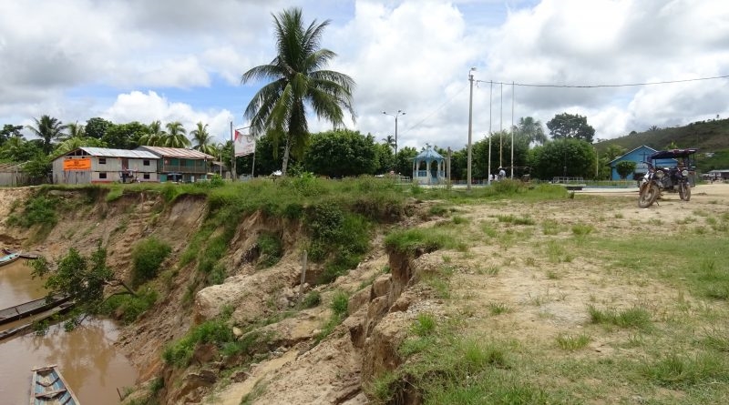 La orilla del río Huallaga está a solo 4 metros de la plaza de Armas condenada a desaparecer, el derrumbe también se llevó el local municipal, viviendas, complejo deportivo.