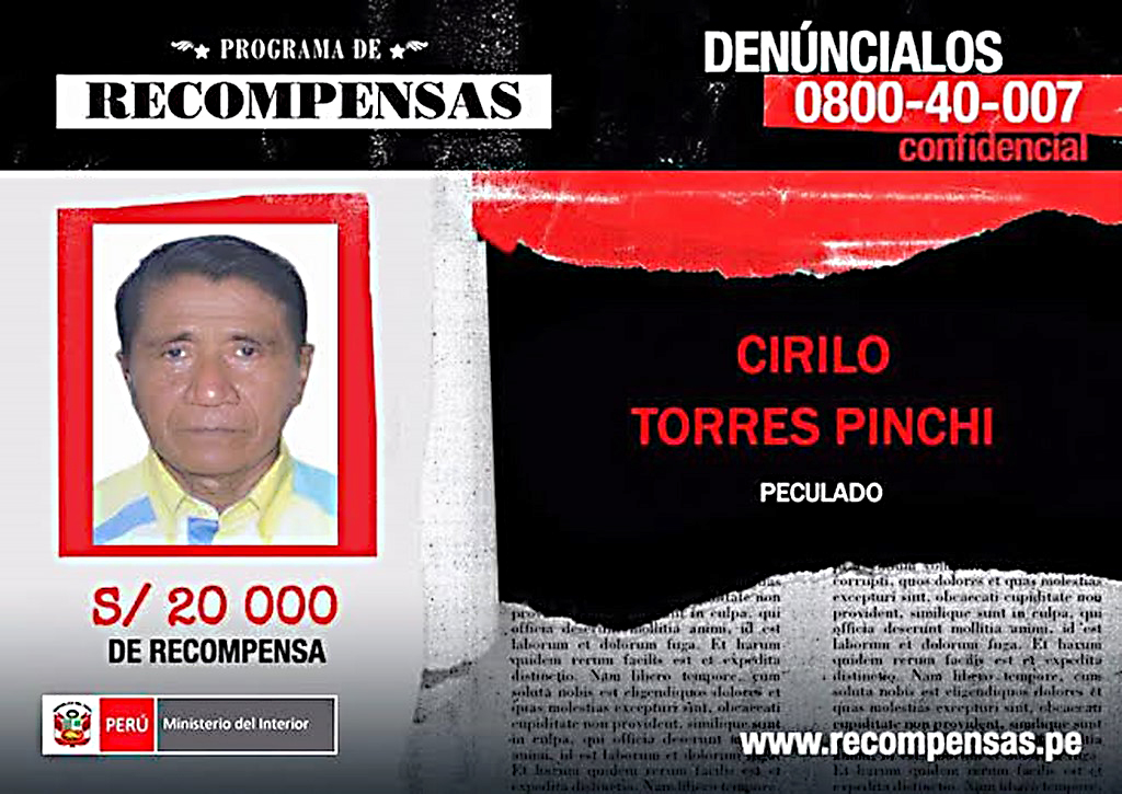 Cirilo Torres Pinchi, natural de la región Loreto, es acusado por el delito de peculado cuando ejerció la función pública bajo el cargo de director regional de Educación, durante el año 1998 se le acusó de haberse apropiado ilícitamente de 15 millones de soles, por lo que se abrió una investigación y el acusado huyó a la clandestinidad por más de dos décadas.