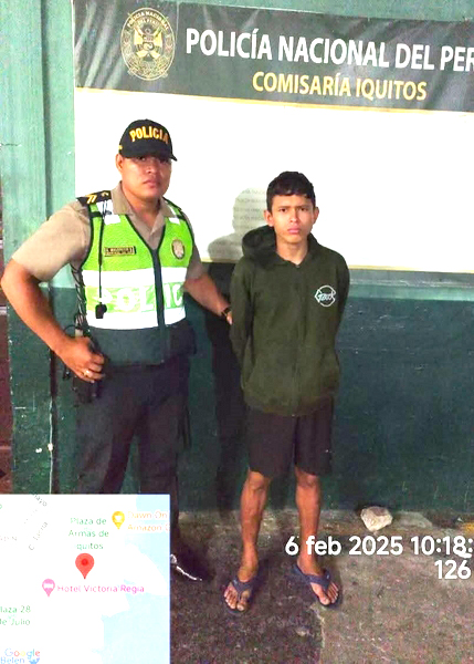 Un joven identificado como Paulo García Yaicate (18) fue capturado en flagrancia por agentes del Serenazgo de Maynas tras robar una laptop del interior de un centro odontológico ubicado en la cuadra 2 de la calle Fanning, en la ciudad de Iquitos.
