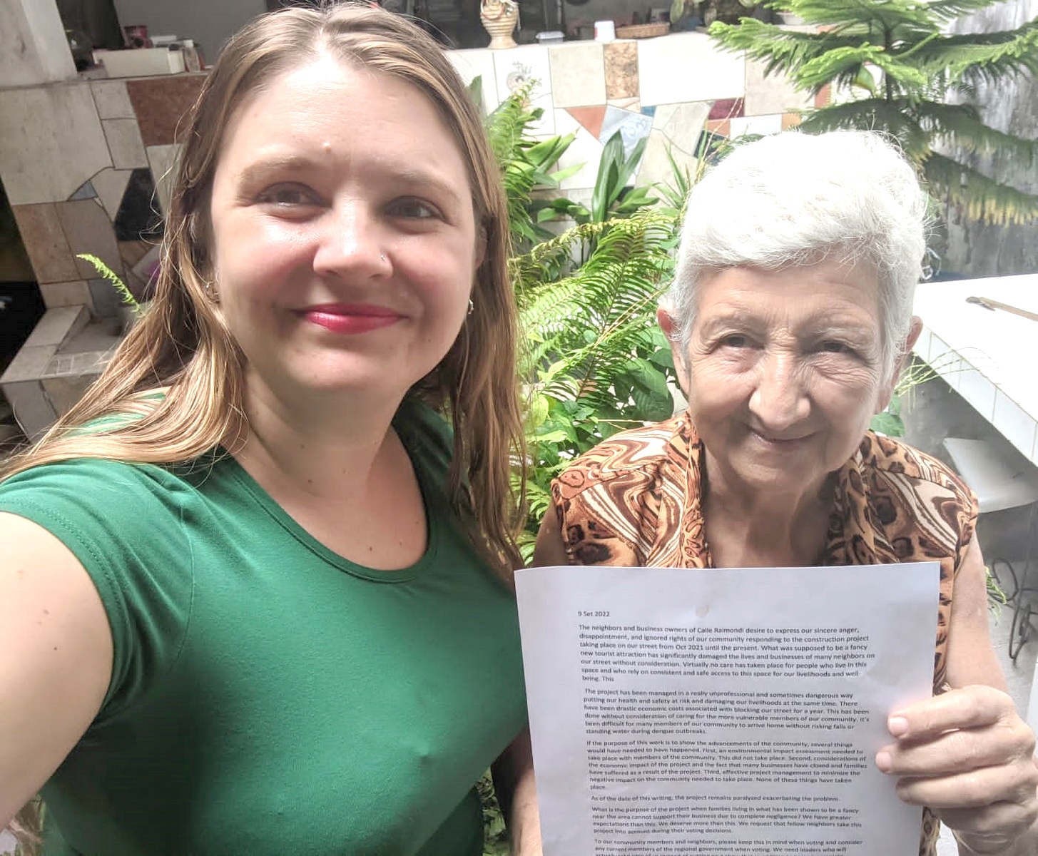 Este proyecto se ha gestionado de forma realmente poco profesional y a veces peligrosa, poniendo en riesgo nuestra salud y seguridad y perjudicando al mismo tiempo nuestros medios de vida. El bloqueo de nuestra calle durante un año ha supuesto un coste económico drástico. Esto se ha hecho sin tener en cuenta el cuidado de los miembros más vulnerables de nuestra comunidad. Ha sido difícil para muchos miembros de nuestra comunidad llegar a casa sin arriesgarse a caídas o a agua estancada durante los brotes de dengue.