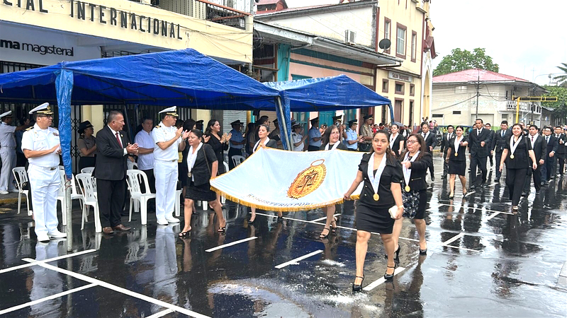 A pesar de la constante lluvia, la delegación del Ministerio Público desfiló con firmeza y espíritu cívico, siendo seguida por las representaciones de la Unidad Médico Legal, la Unidad Distrital de Asistencia a Víctimas y Testigos (Udavit), y el Programa de Justicia Juvenil Restaurativa. Este último tuvo una participación simbólica y conmovedora, al desfilar sus integrantes portando antifaces, como representación del proceso de reflexión, reintegración y oportunidad que promueve dicho programa en jóvenes en conflicto con la ley penal.