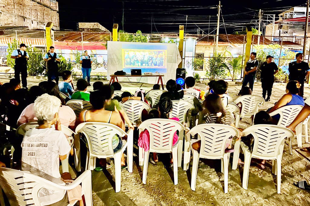 La Gerencia de Seguridad Ciudadana de la Municipalidad de Maynas en trabajo articulado con el Comité de Prevención de Seguridad Ciudadana (COPROSEC) presentan la iniciativa «Cine en tu Barrio», que se llevó a cabo en la Plaza Manuel Clavero y que se realiza en otras plazas y espacios públicos de la ciudad. Este programa busca revitalizar y dinamizar los espacios abiertos, promoviendo actividades deportivas, culturales y de sana diversión para toda la comunidad, en un ambiente más seguro y amigable.