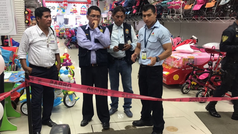 En el operativo se realizó la inspección del estado y la seguridad de los almacenes del establecimiento comercial, encontrando la realización de trabajos de mantenimiento a una de las escaleras eléctricas con insuficiente medidas de seguridad, las cuales podrían ocasionar algún accidente. Seguidamente, es una escalera eléctrica del segundo piso, la baranda de los laterales posteriores no cuenta con algún tipo de seguridad.