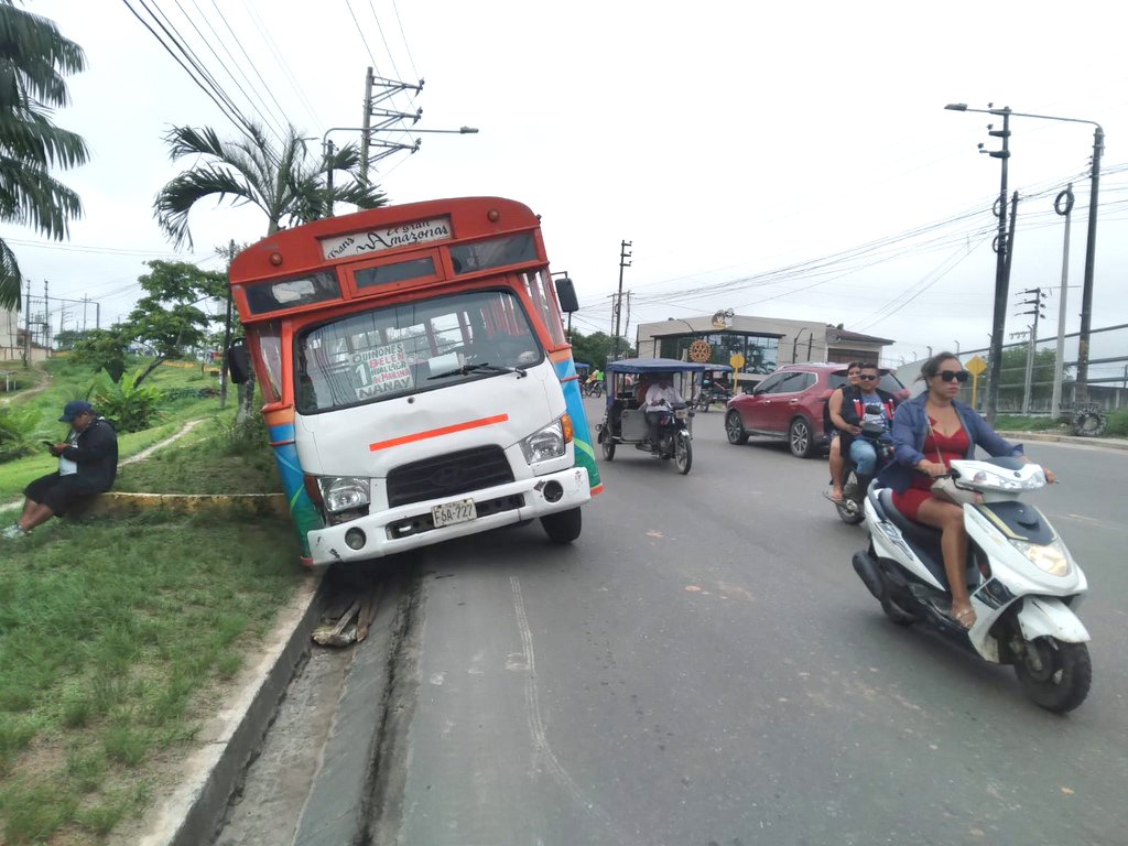 Un colectivo de la empresa transporte El Gran Amazonas, sufrió de un despiste mientras recorría la avenida José Abelardo Quiñones en el distrito de San Juan Bautista, el hecho provocó un enorme temor entre sus pasajeros, quienes se salvaron de la caída a un desnivel de la zona.