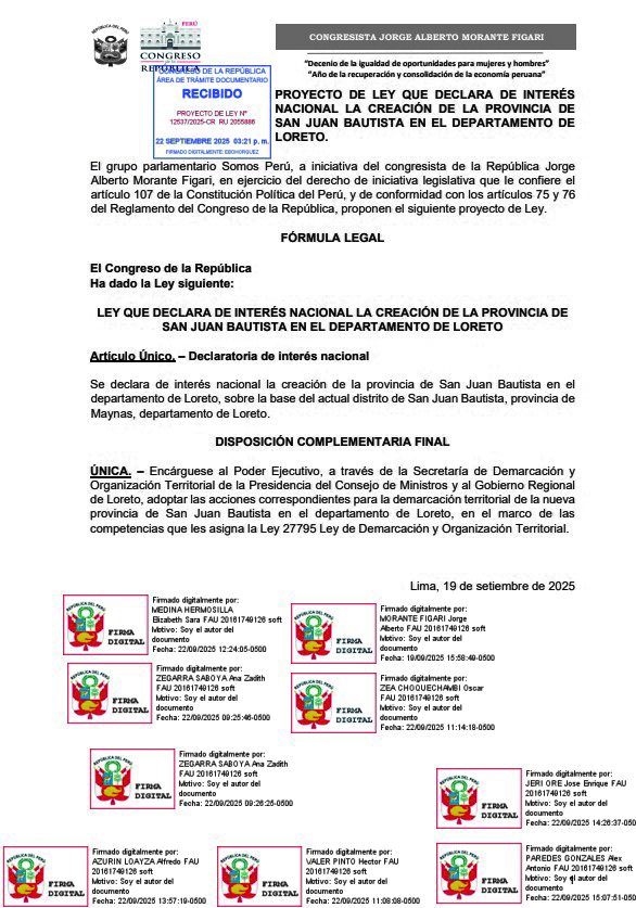 El congresista de la República Jorge Alberto Morante Figari, integrante del grupo parlamentario Somos Perú, presentó un proyecto de ley que declara de interés nacional la creación de la provincia de San Juan Bautista, en la región de Loreto.
