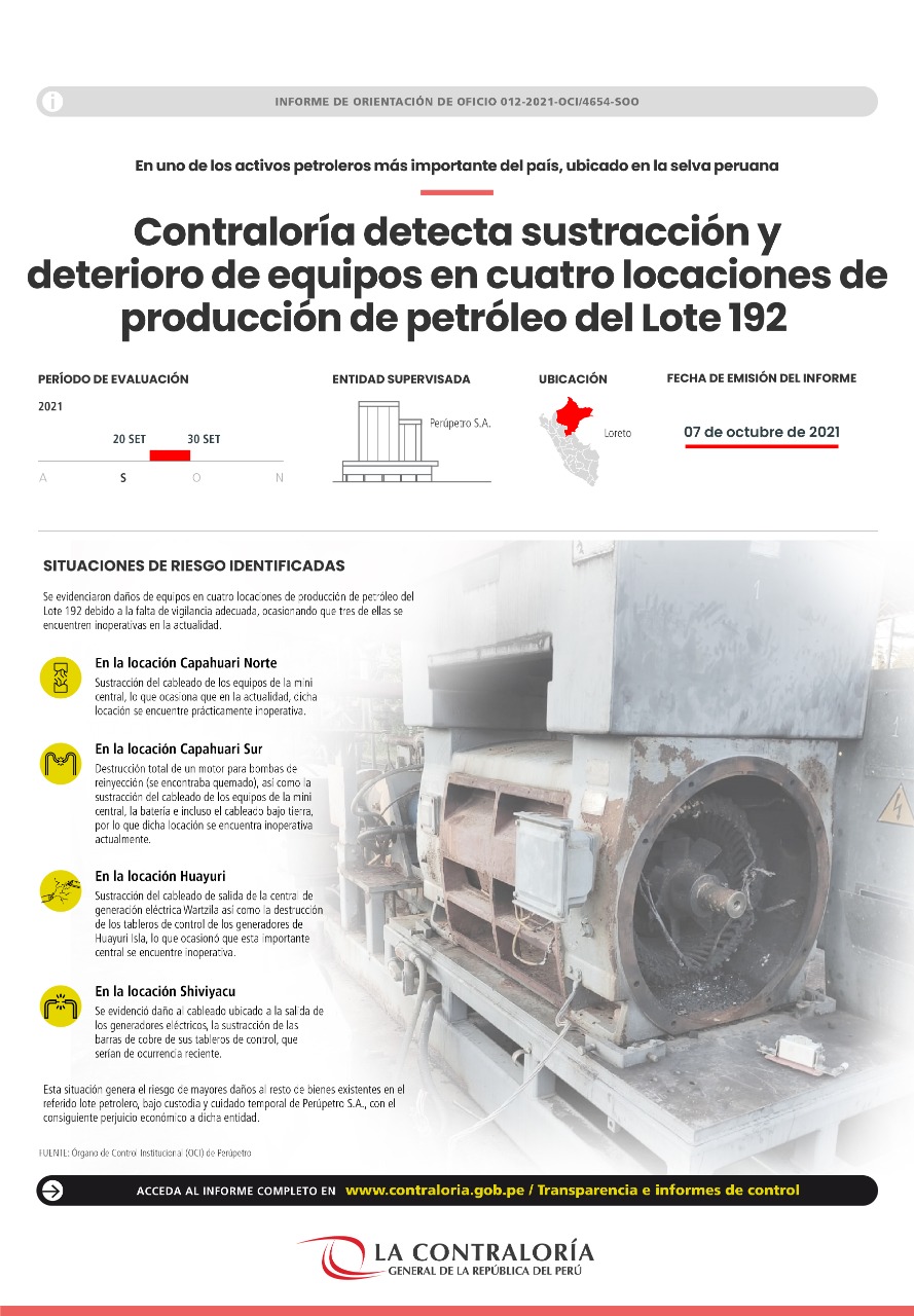 La Contraloría General evidenció daños de equipos en cuatro locaciones de producción de petróleo del Lote 192, en la región Loreto, debido a la falta de vigilancia adecuada, ocasionando que tres de ellas se encuentren inoperativas en la actualidad. Esta situación genera el riesgo de mayores daños al resto de bienes existentes en el referido lote petrolero, bajo custodia y cuidado temporal de Perúpetro S.A., con el consiguiente perjuicio económico a dicha entidad.