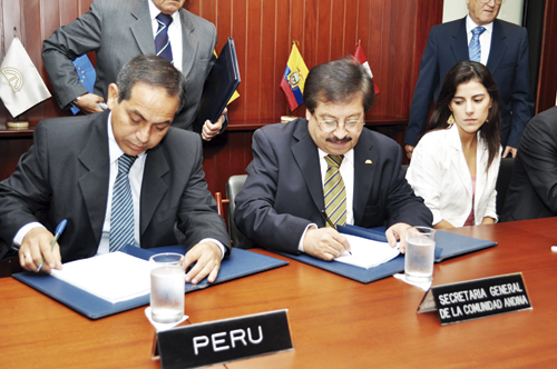 Un contrato de subvención que permitirá poner en marcha el primero de los cinco proyectos que impulsan la Secretaría General de la Comunidad Andina y la Unión Europea en las fronteras andinas, en el marco del Proyecto CESCAN II, fue suscrito este jueves por Adalid Contreras Baspineiro, Secretario General de la CAN, y William Pablo Soria Ruiz, Director Ejecutivo del Proyecto Especial Desarrollo Integral de la Cuenca del Río Putumayo de Perú (PEDICP).