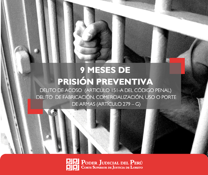 El magistrado Dr. Gino Tello Dantas, titular del Segundo Juzgado de Investigación Preparatoria de Maynas, con celeridad y determinación DICTÓ mandato de PRISIÓN PREVENTIVA POR EL PLAZO DE 09 MESES contra Ángel Arturo Macca Gonzales (28), por la presunta comisión del delito previsto en el Articulo 151-A del Código Penal – Acoso en agravio de Rossi Grece Macedo Chujutalli, agente de inteligencia de la PNP, y por el delito previsto en el Artículo 279 – G del Código Penal – Fabricación, comercialización, uso o porte de armas en agravio del Estado – Ministerio del Interior, Policía Nacional del Perú.