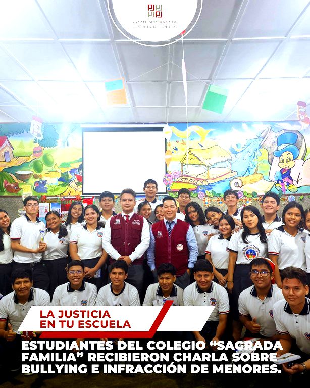 Con el firme propósito de fortalecer la prevención de la violencia escolar y promover una cultura de respeto entre adolescentes, la Corte Superior de Justicia de Loreto, llevó a cabo una charla informativa dirigida a los estudiantes del Colegio Sagrada Familia del sector de Cardoso, enfocada en el bullying y en las infracciones cometidas por menores de edad.
