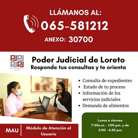 La Corte Superior de Justicia de Loreto con la firme vocación de brindar un mejor servicio a la comunidad inaugura, hoy, dos nuevos servicios: el “Módulo de Atención al Usuario Judicial (MAU)” y la plataforma web “El Servicio de Justicia En Tus Manos”.