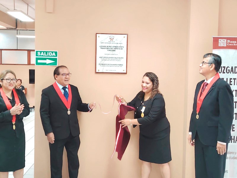 Seguidamente se procedió a la tradicional develación de placa y corte de cinta a cargo del Presidente de la Corte y la flamante magistrada, acompañados de los magistrados Bethy Vilma Palomino Pedraza y el Dr. Gary Martín David Nolasco Velezmoro, jueces de la Sala Superior de Emergencia.