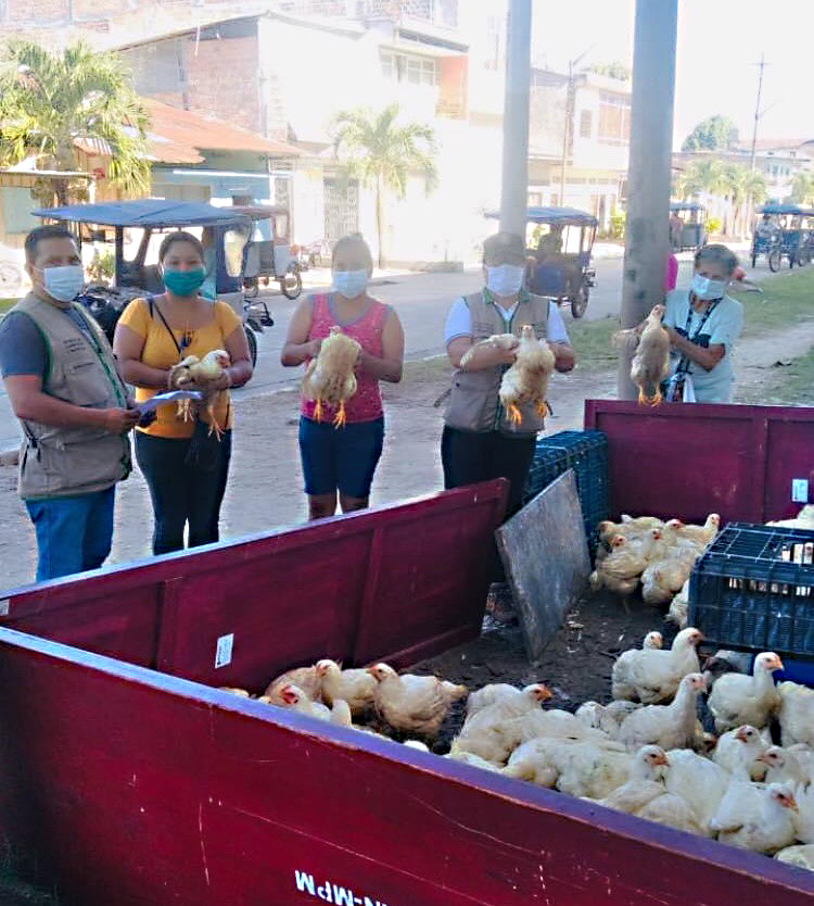 Los productos alimenticios que se entregan consisten en arroz mejorado, frejol, aceite y pollo vivo.