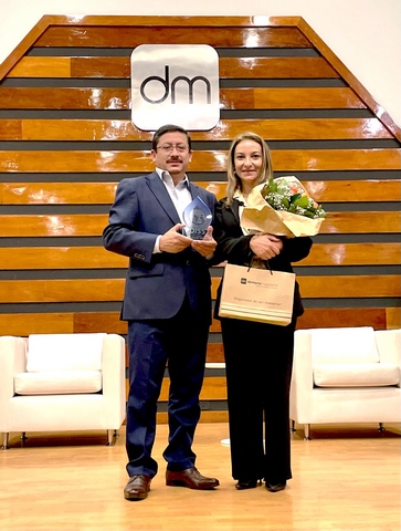 Dicho galardón fue entregado por Tatiana Céspedes, directora adjunta del Centro Regional de la OISS, a Luis Espinoza, profesor y presidente de Derrama Magisterial, en el auditorio de la oficina principal de Derrama Magisterial.