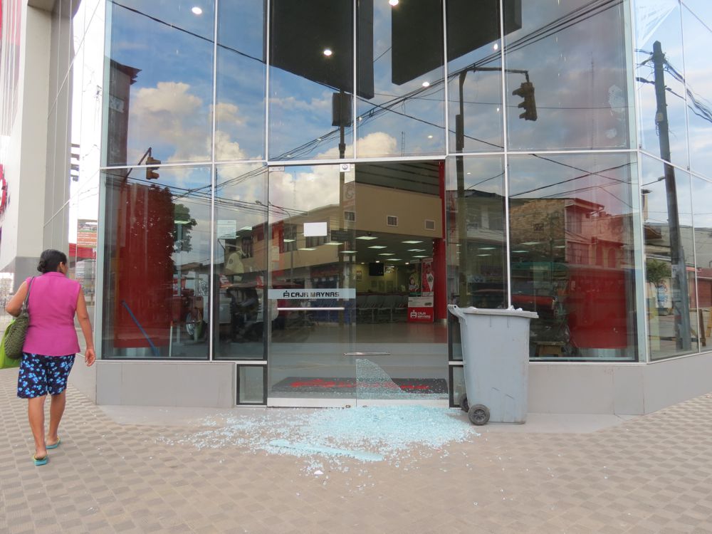 La entidad financiera «Caja Maynas» habría sufrido un atentado la madrugada de ayer, luego que sujetos desconocidos violentaran y rompieran la puerta de vidrio que da acceso a este local. En el lugar se encontraban el vigilante y un funcionario, quien en todo momento cogía su teléfono para tratar de comunicarse con alguien y explicar lo que había sucedido.