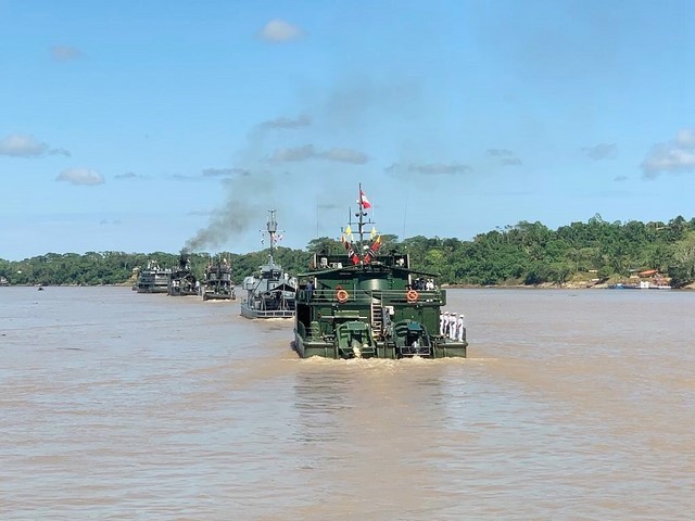 Al poco tiempo todos se dirigieron al segundo estrado ubicado frente al río Amazonas para a continuación ver el desplazamiento de las naves fluviales de Brasil, Colombia y el Perú. Llegaron 3 buques de Brasil y uno de Colombia, que retornan a sus países el día de mañana.