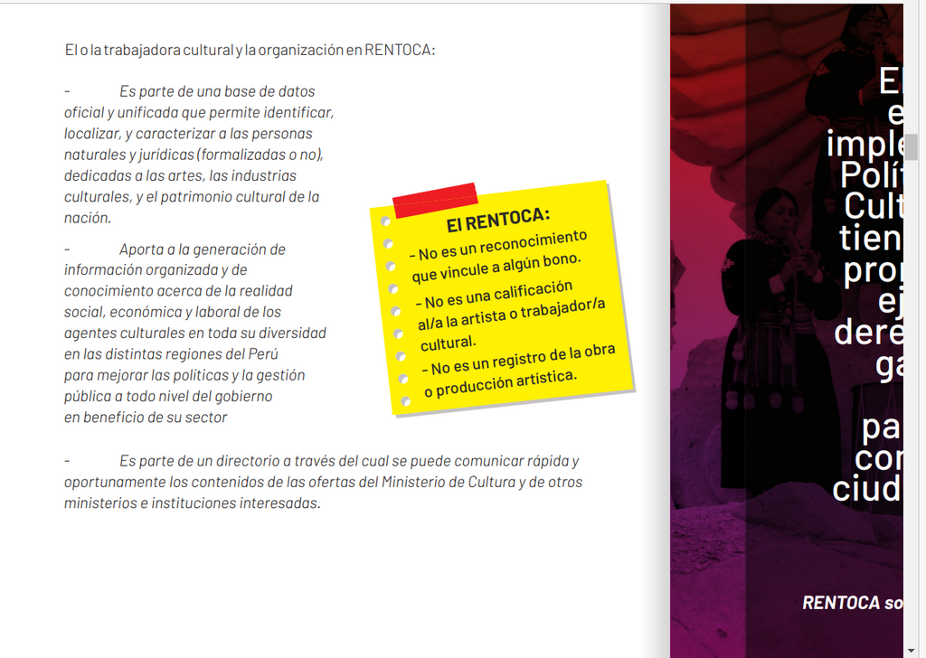 Se nos ha discriminado, se ha favorecido y considerado sólo a una categoría a pesar de que las organizaciones cumplen los requisitos de inscripción y el glosario del Manual RETOCA como prestadores de servicios culturales y artísticos.