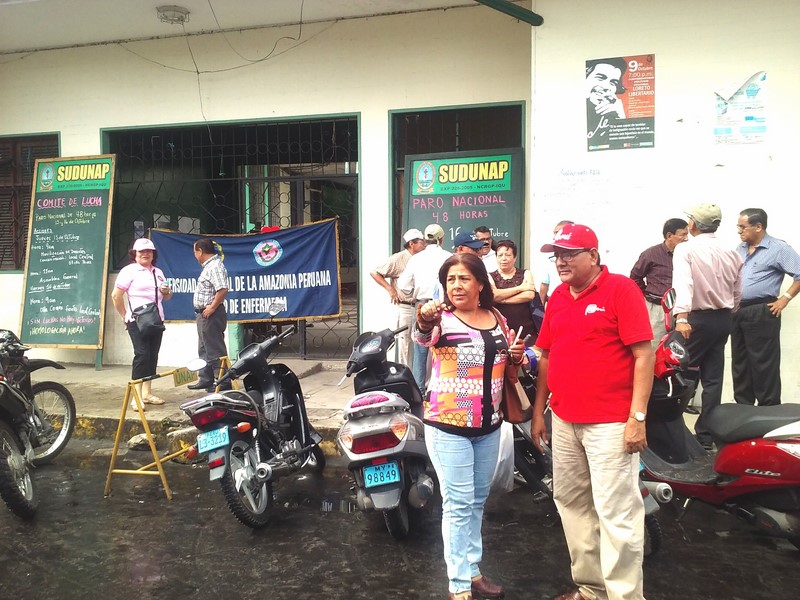 Desde ayer los profesores de la Universidad Nacional de la Amazonía Peruana vienen sumándose al paro nacional de 48 horas, reclamando el aumento de sus haberes, ya que la ley universitaria 30220 en su artículo 96° establece que las remuneraciones de los docentes universitarios se homologa con la de los magistrados judiciales.
