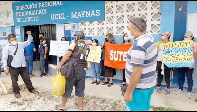 Decenas de docentes protestaron el día de ayer en el frontis de la Unidad de Gestión Educativa Local (UGEL) Maynas, para exigir más plazas de contrato a las autoridades, tras aprobar el examen de nombramiento del sector educación.