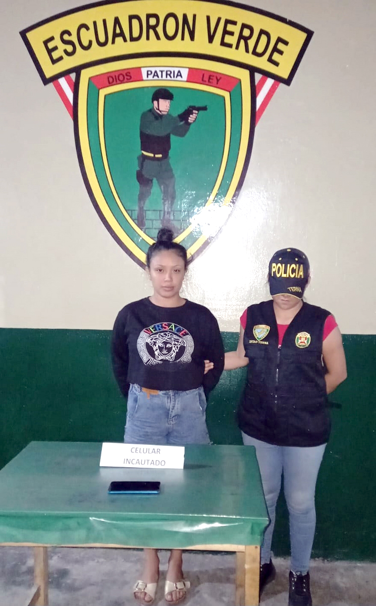 La mujer que responde al nombre de María Luisa del Águila Alván (25), fue intervenida por agentes PNP femenino del Escuadrón Verde – Grupo Terna Iquitos, por encontrarse inmersa en la presunta comisión del delito contra el patrimonio – receptación agravada de equipo celular.