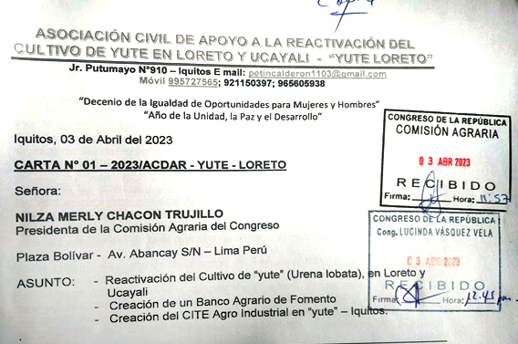Si todos nosotros agricultores y asociaciones civiles, Colegio de Ingenieros, capítulo de Agrónomos, Frente Patriótico en su mayoría, ponen también juntos el interés de favorecer directamente a los agricultores, de Loreto y Ucayali, ellos tendrán ese alivio que tenían cuando existía una entidad crediticia que apoyaba a la agricultura, como era el Banco Agrario. Con su desaparición se marcó el primer hito, el primer punto negro, quizá del gobierno fujimorista que en lugar de apoyar a la agricultura dejó al desamparo a miles de ellos, y siempre dirán esa frase que hasta ahora tintinea en el cerebro de los agricultores, “queremos un Banco Agrario para reactivar nuestros cultivos, así como el cultivo de yute (Urena lobata) en las regiones de Loreto y Ucayali”.