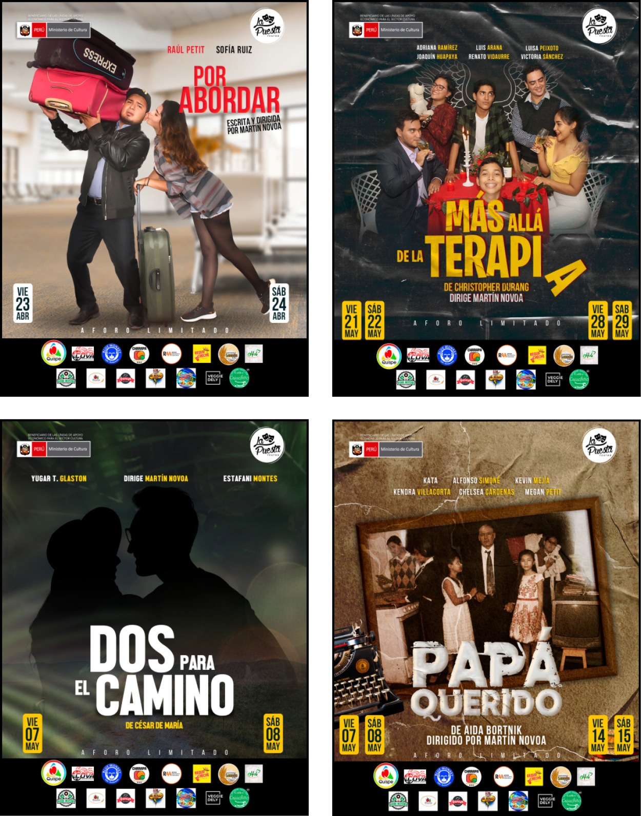 Ellos, escapando de sus historias y sin tener donde ir, eligen esa estación de tren que será cómplice de su sueño y los arropará para que el frío de la soledad no apague el alma de estos dinosaurios. “Por abordar”: Una metida de pata, le costará a Deby algo más que perder su vuelo, el encuentro con un extraño, se volverá para ella un completo tormento, mientras espera por abordar. “Más allá de la terapia”: Una cita a ciegas, puede desencadenar en la más hilarante confusión amorosa, y todos necesitarán ir a terapia, lo que no se imaginan es que los terapeutas resultarán estar más perturbados que los propios pacientes. “Dos para el Camino”: Nos adentramos a un mundo de locura, el caos y los dobles, nos conduce casi a tientas por los lugares más íntimos de nosotros mismos, nos toca, nos enfrenta con nuestros propios sentimientos, a través de cinco historias, dos por el camino, nos llevará por realidades aparentemente distintas, que pondrán en jaque nuestra propia existencia. “Papá Querido”: Un grupo de hermanos que crecieron creyendo que eran hijos únicos, se encuentran en el funeral de su padre, pronto, irán revelando sus verdaderas identidades, dando a conocer distintas facetas de sus vidas y dándose cuenta que no todo era como parecía ser.