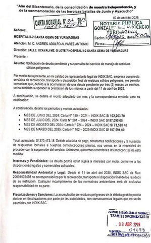 Mediante una carta notarial, la empresa informó que a partir del 11 de abril de 2025 dejará de realizar las labores de recolección, transporte y disposición final de residuos peligrosos, debido a la falta de pago superior a los S/ 370,000 por parte del hospital.