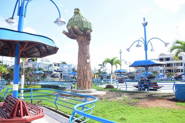 Esta estampa elaborada íntegramente de retazos de madera reciclada tiene la forma de un inmenso brazo vertical que sostiene con la mano la imagen de un Juane, potaje típico y tradicional de la selva peruana que identifica al distrito de San Juan Bautista. Tiene 6.8 metros de altura (casi 7 metros) , el pedestal es de 1 solo tronco de madera mohena negra (shungo) , en su composición cuenta con casi 700 piezas de retazos de madera reciclada donde resaltan la mohena negra, el palisangre y el azúcar huayo. Piezas de todo tamaño armados como un rompecabeza de retazos largos, cuadrados, anchos, cruzetas y sogueados. Utilizaron pintura satinada de madera como base y el acabado barnizado con barniz marino, tipo plastificado esoecial para soportar calor y lluvia. La figura del Juane sostenida por la mano, es una verdadera obra de arte. Una joya artística en retazos de madera.
