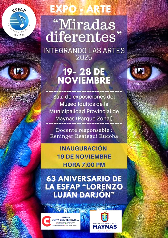 El martes 18 se desarrollarán dos exposiciones académicas: “La ética en la función docente”, a cargo del reverendo Agustín Raygada Flores, y “El Kichwa en la Amazonía Peruana”, que se presentará en el auditorio de la ESFAP. El miércoles 19 se realizará una mañana deportiva en el Parque Zonal y la inauguración de la exposición pictórica Integrando las Artes 2025: Miradas diferentes, abierta al público hasta el 28 de noviembre en el Museo Iquitos.